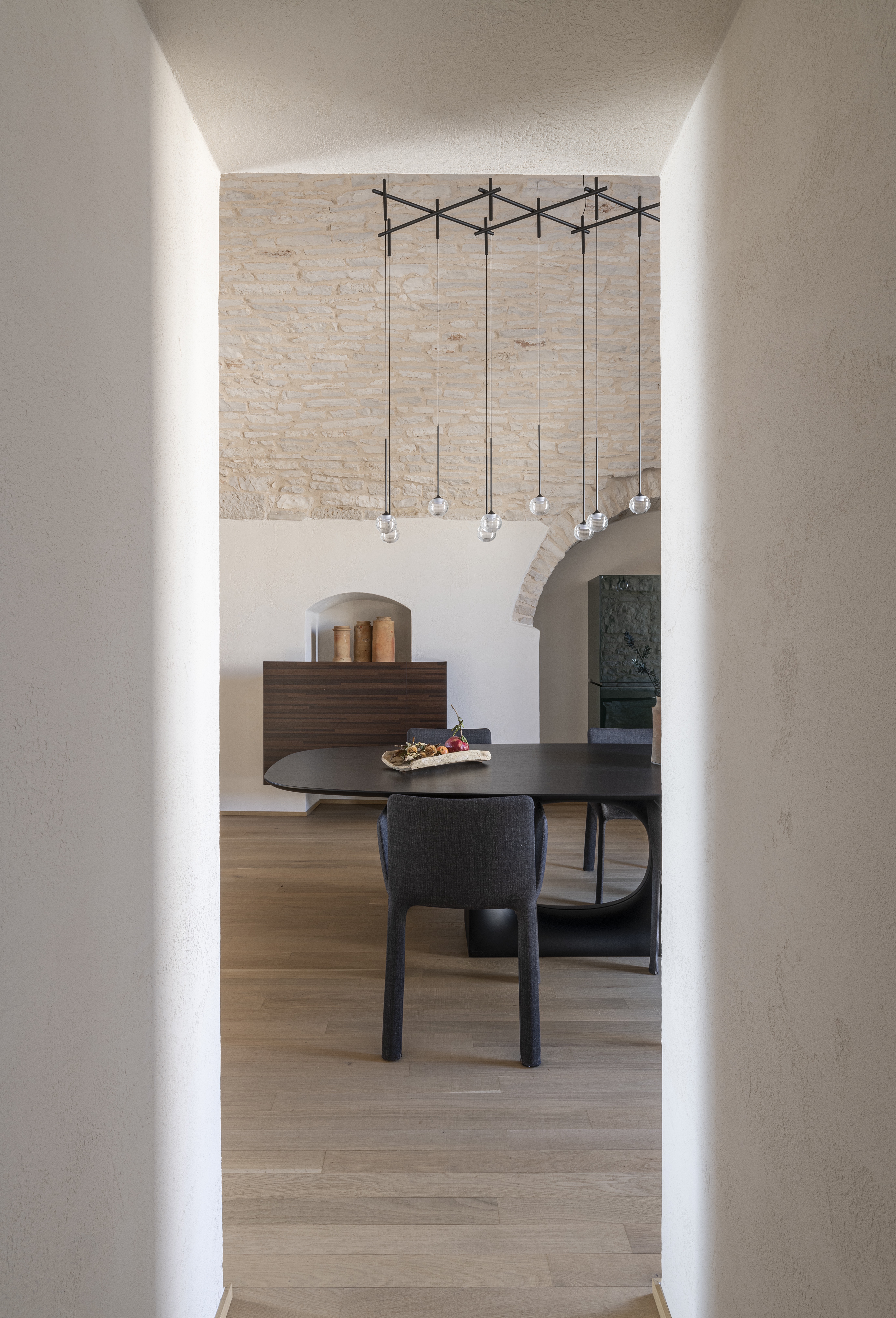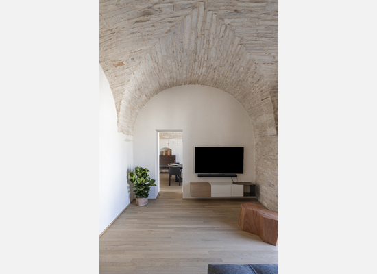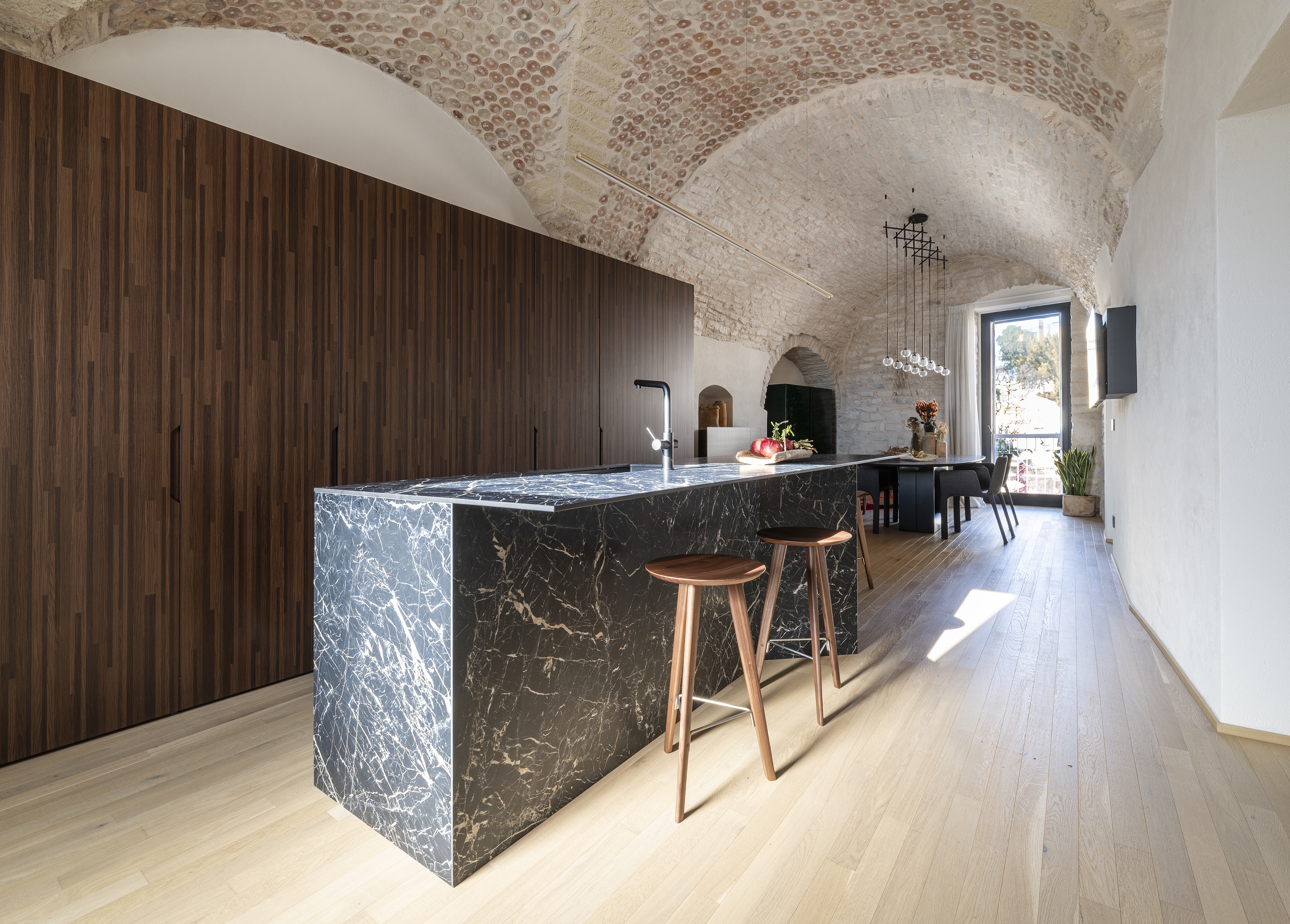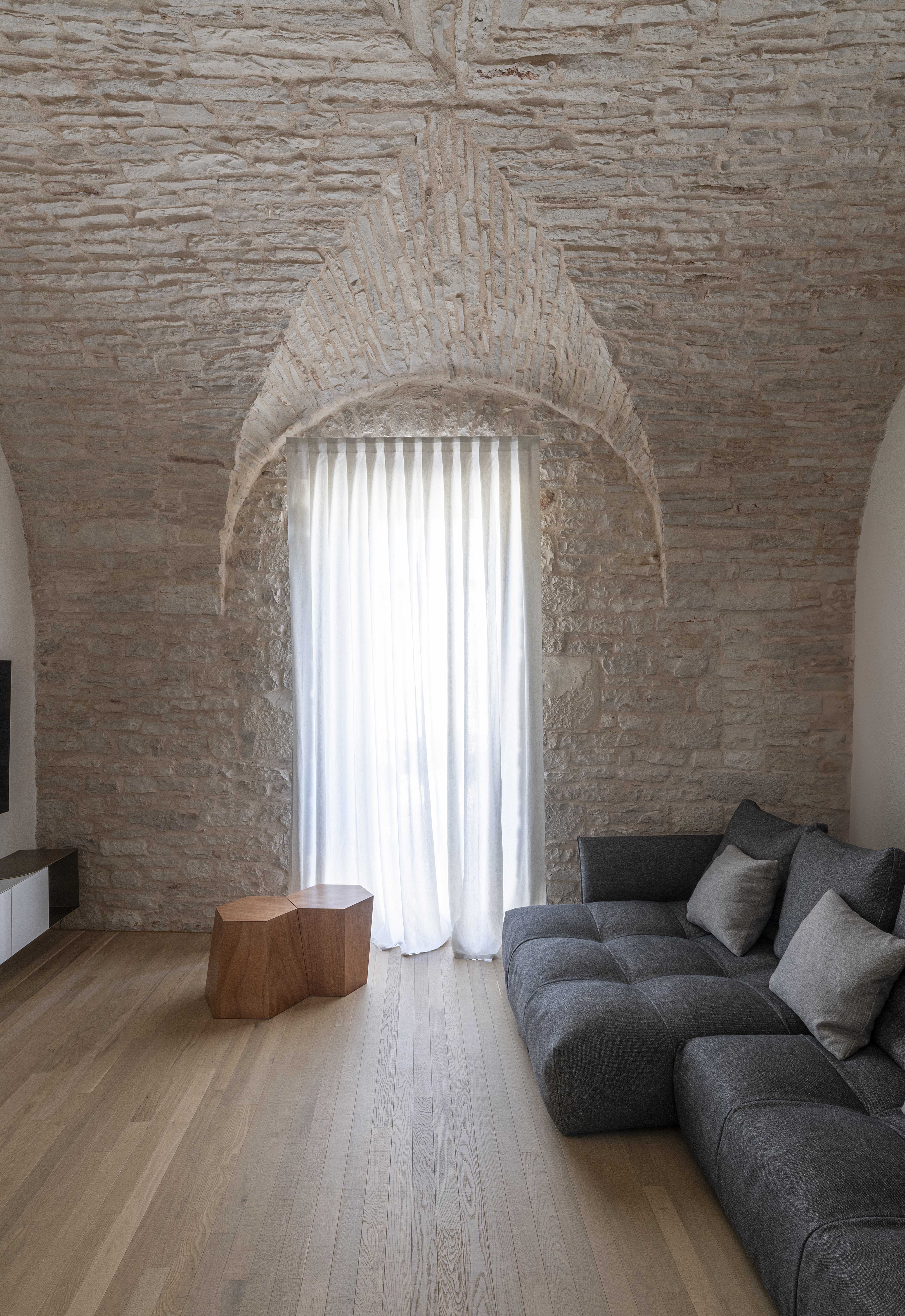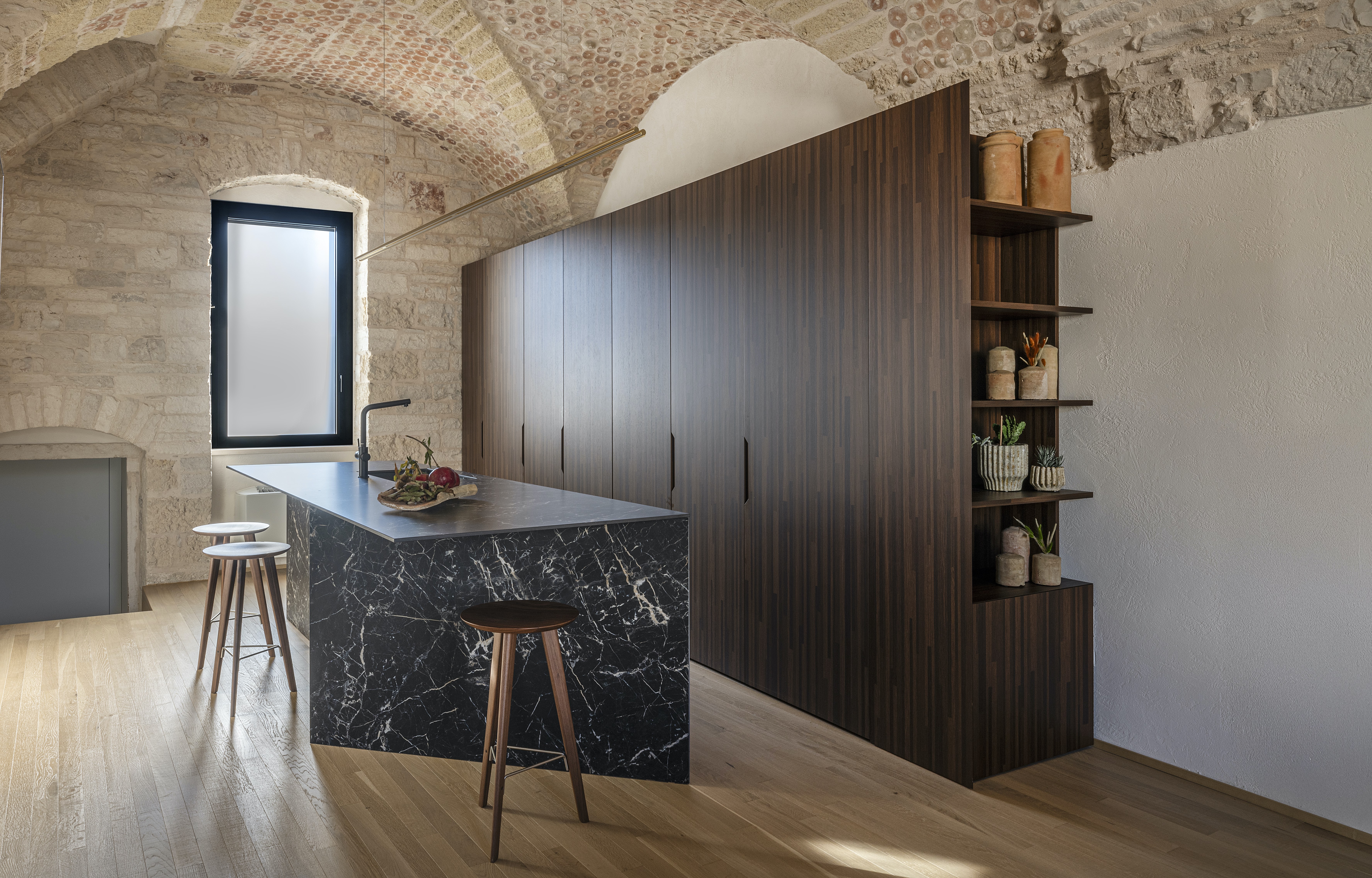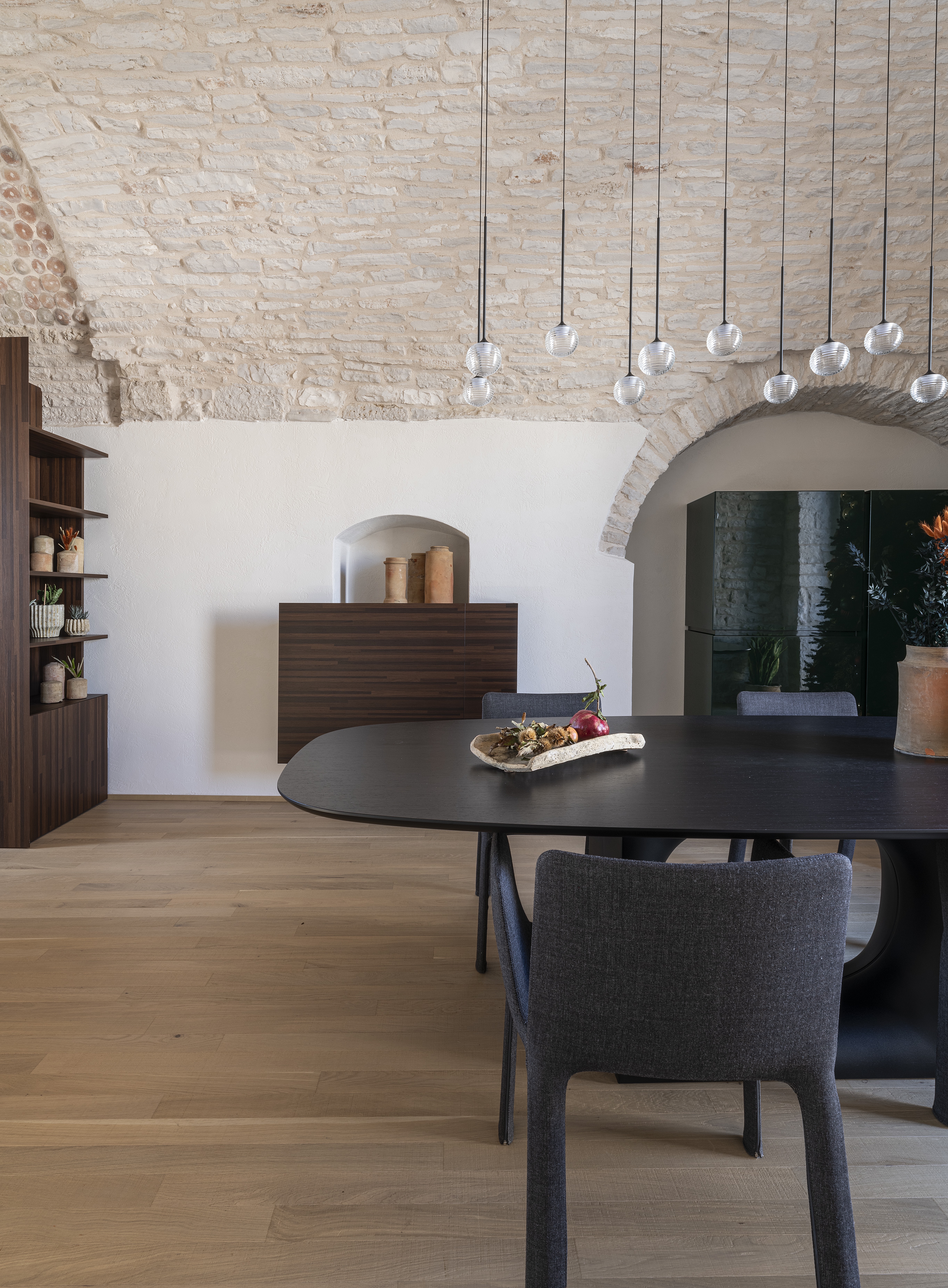 Le volte storiche, liberate da elementi superflui, tornano protagoniste e contribuiscono a un’atmosfera autentica e avvolgente.