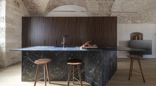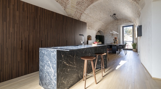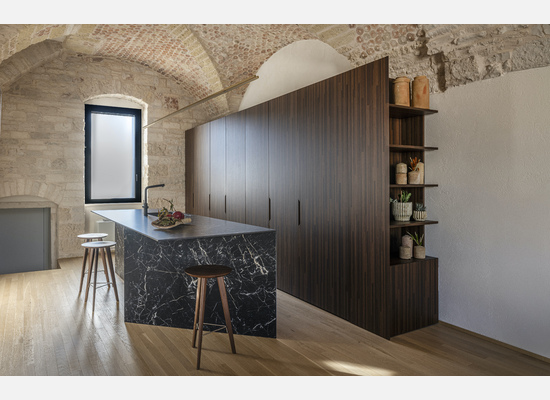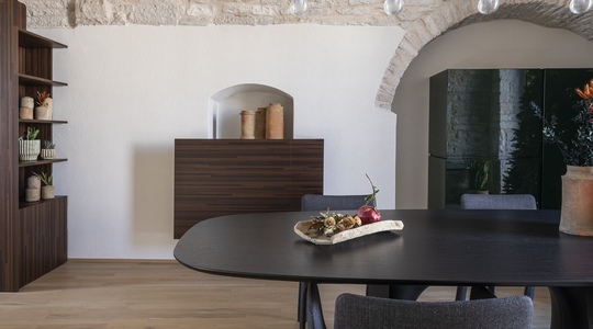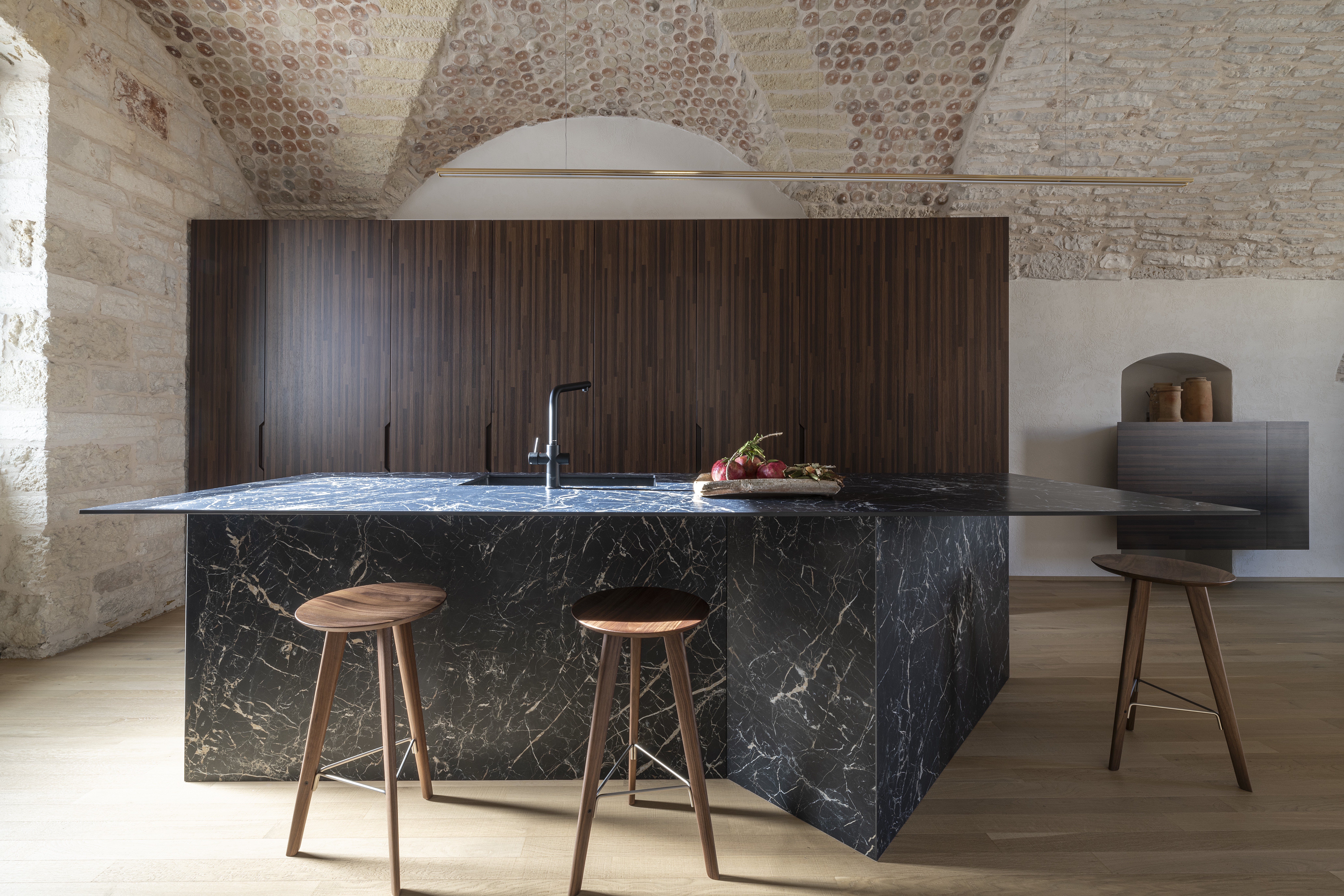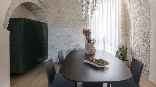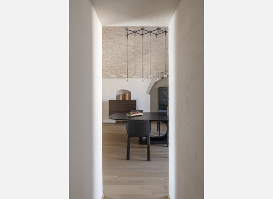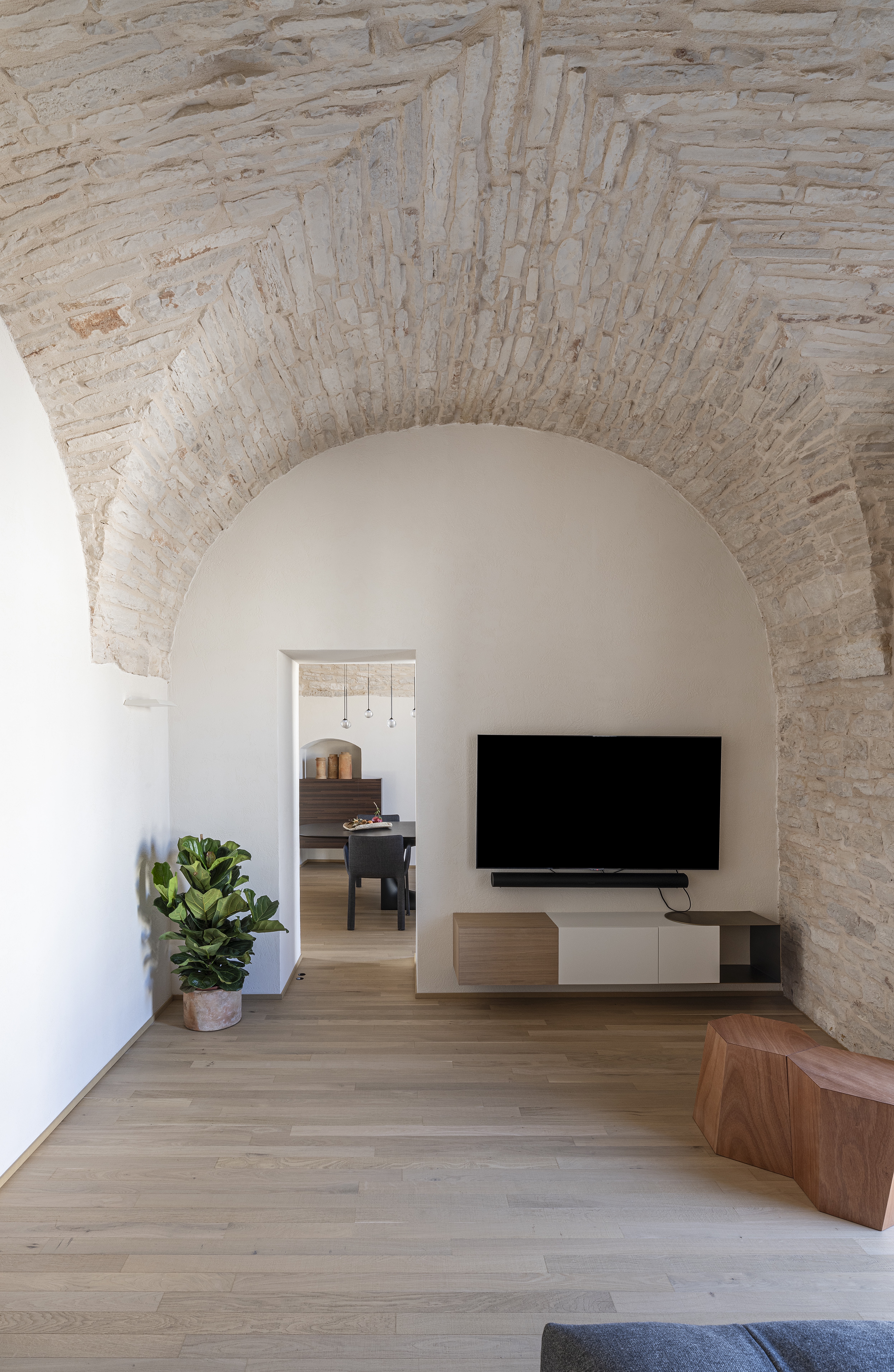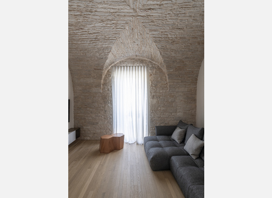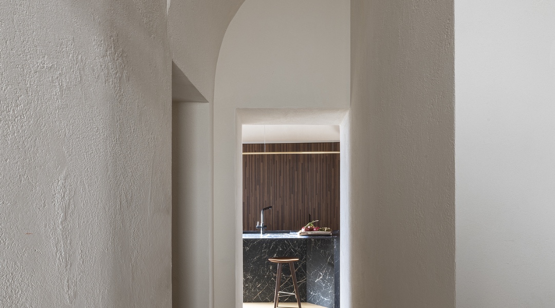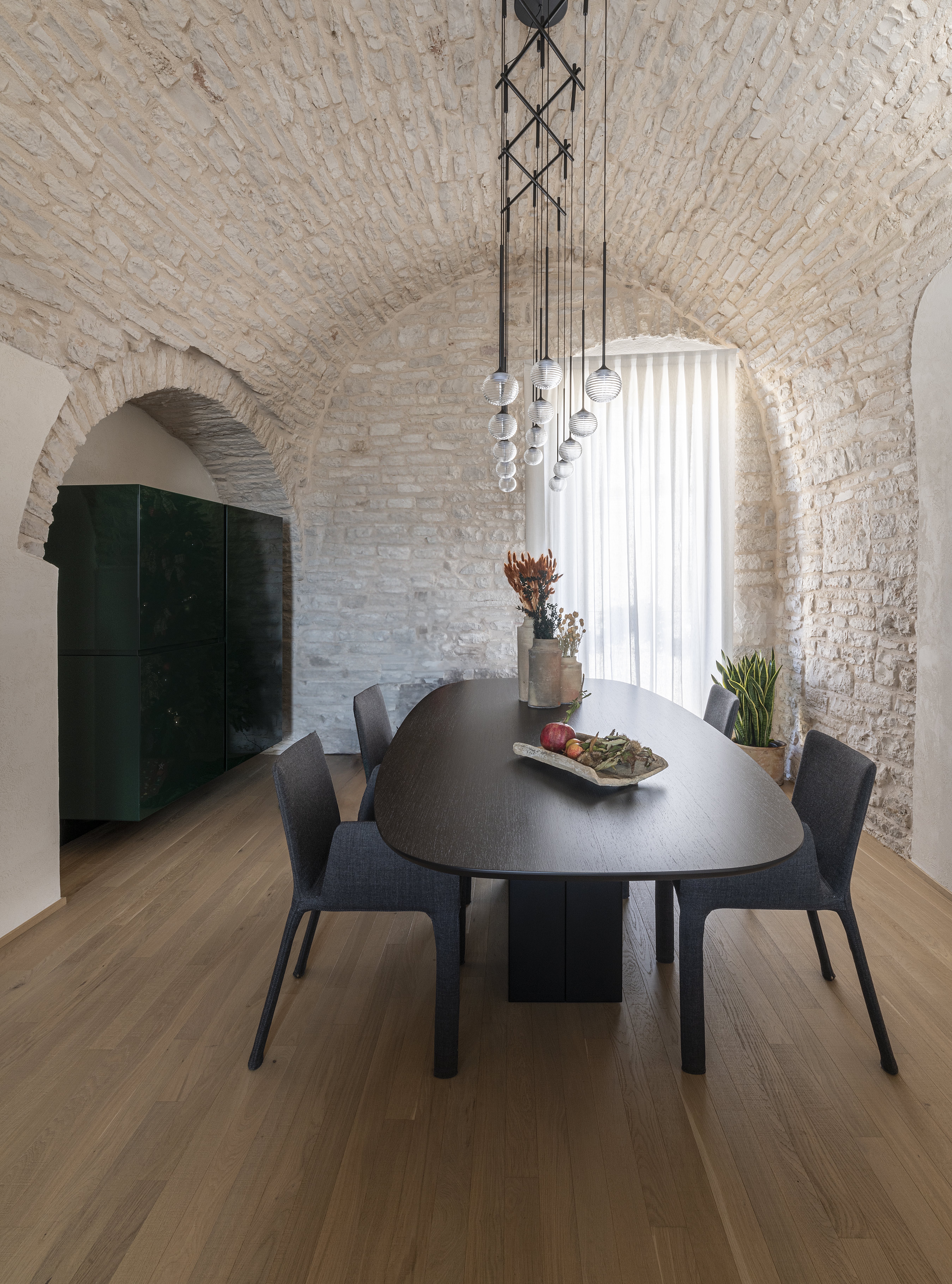 Le volte storiche, liberate da elementi superflui, tornano protagoniste e contribuiscono a un’atmosfera autentica e avvolgente.