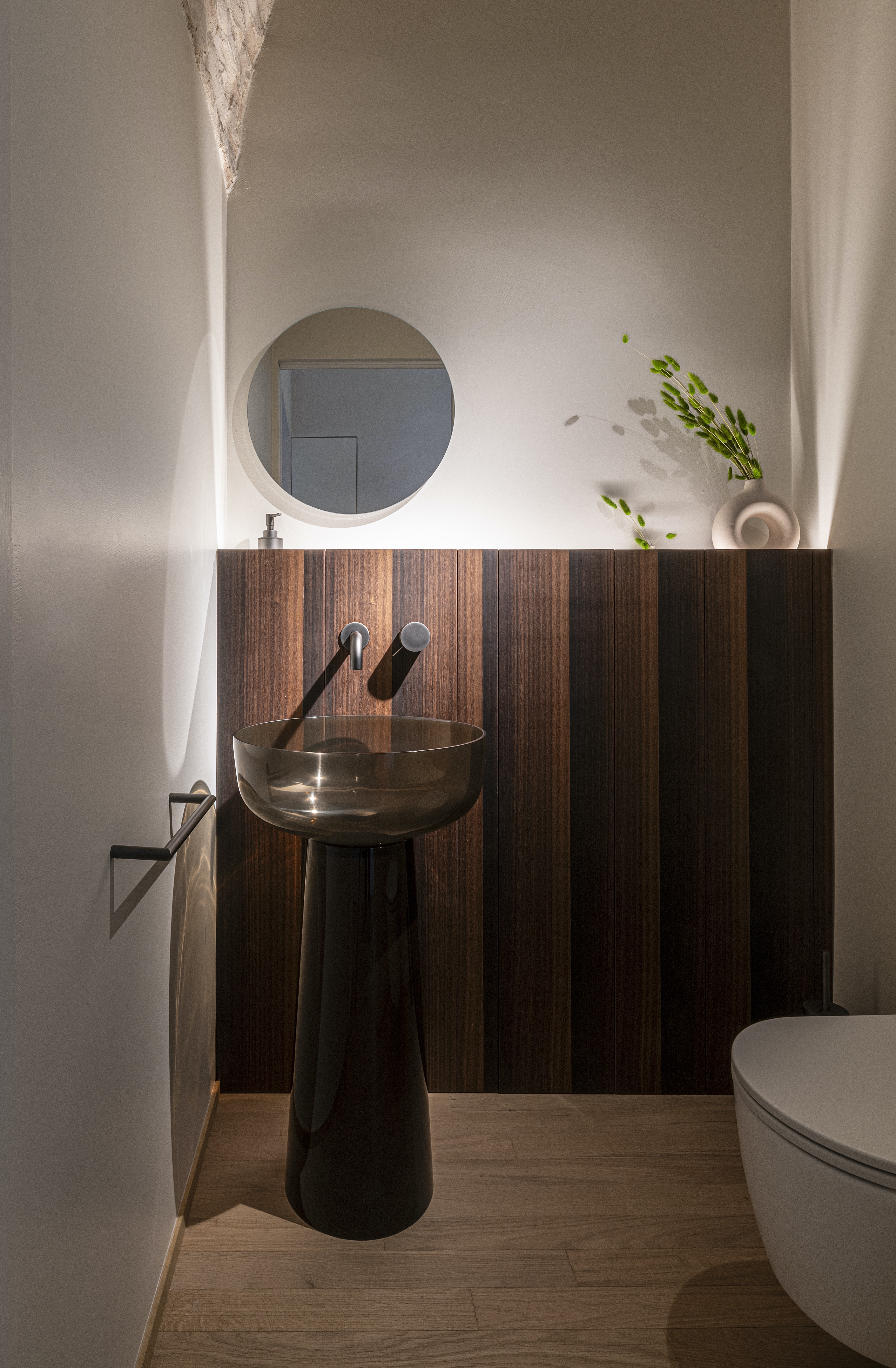 La scelta di pochi materiali naturali — legno, calce, pietra — restituisce calore, equilibrio e una forte sensazione tattile.